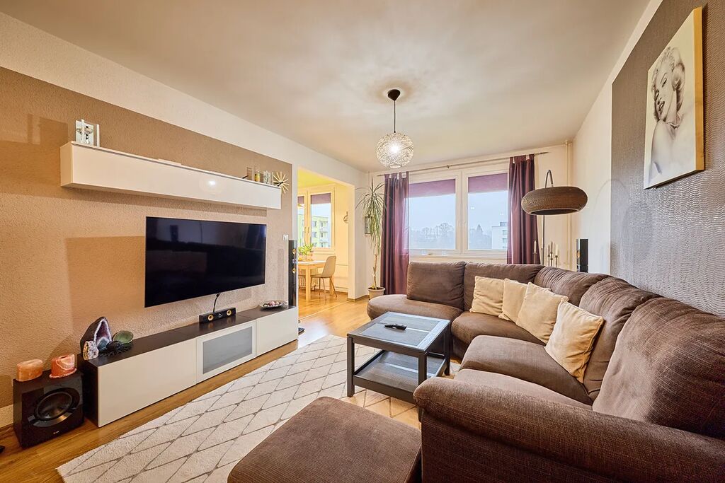 Díky šikovné dispozici je byt ideální k rodinnému bydlení. Pokud bude v bytě bydlet čtyřčlenná rodina, tak každé dítko může mít vlastní pokoj a rodiče ložnici. V prodeji včetně veškerého vybavení (mimo elektroniky).