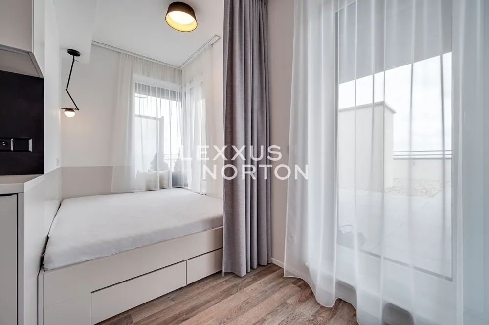Tento světlý zařízený byt 1+kk o výměře 39 m2, situovaný ve 12. patře domu s výtahem disponuje vzdušným obývacím pokojem (29 m2) s designovým kuchyňským koutem, oddělenou ložnicovou zónou a vstupem na jedinečnou střešní terasu o ploše 173 m2. K bytu dále náleží moderní koupelna a vstupní hala.