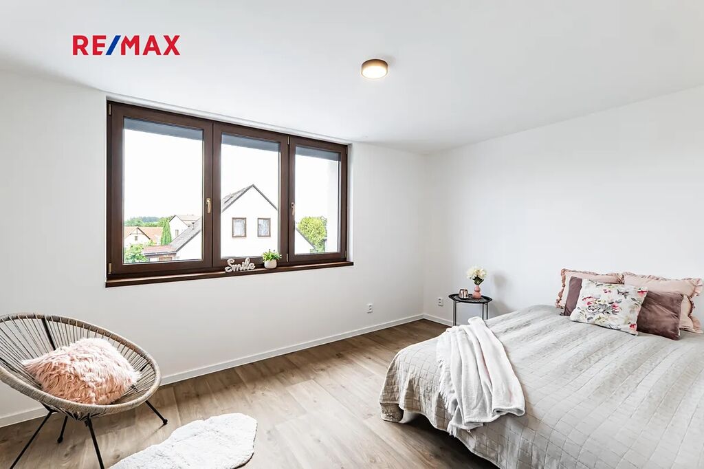 V patře se nachází další ložnice s balkonem, koupelna s vanou, praktický kumbál a tři další místností. V jedné z nich je navíc příprava na druhou kuchyni – ideální pro dvougenerační bydlení nebo při rozdělení domu na dvě bytové jednotky.