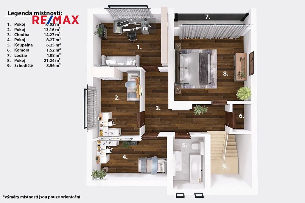 Orientační výměry jednotlivých místností jsou zmíněné v přiložených půdorysech. Spolu s tím Vám doporučujeme projít si nemovitost za pomoci 3D virtuální prohlídky, která Vám dopomůže k plné představě o rozložení jednotlivých místností.