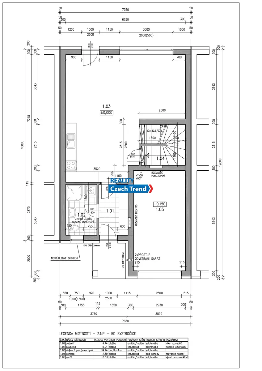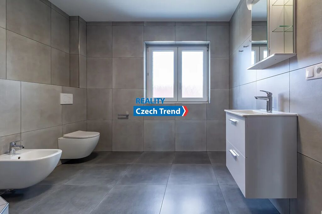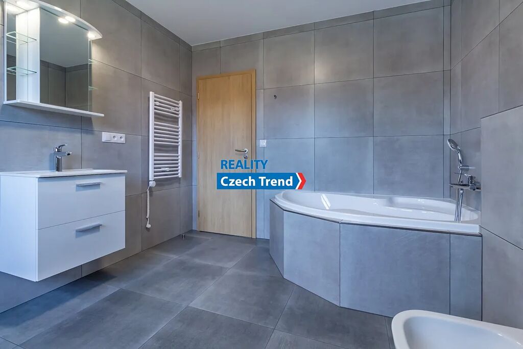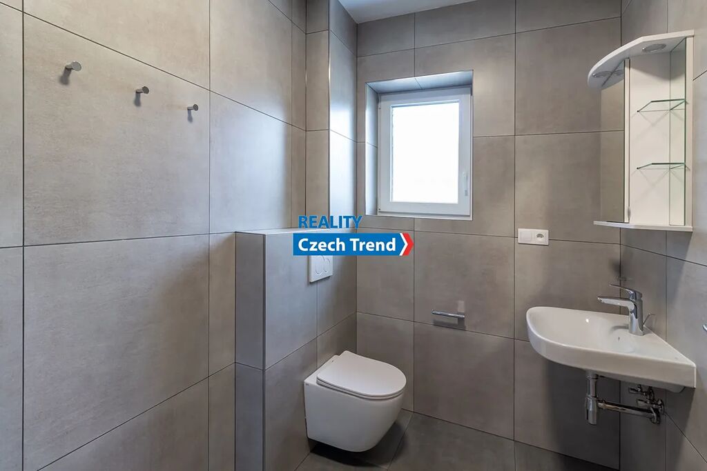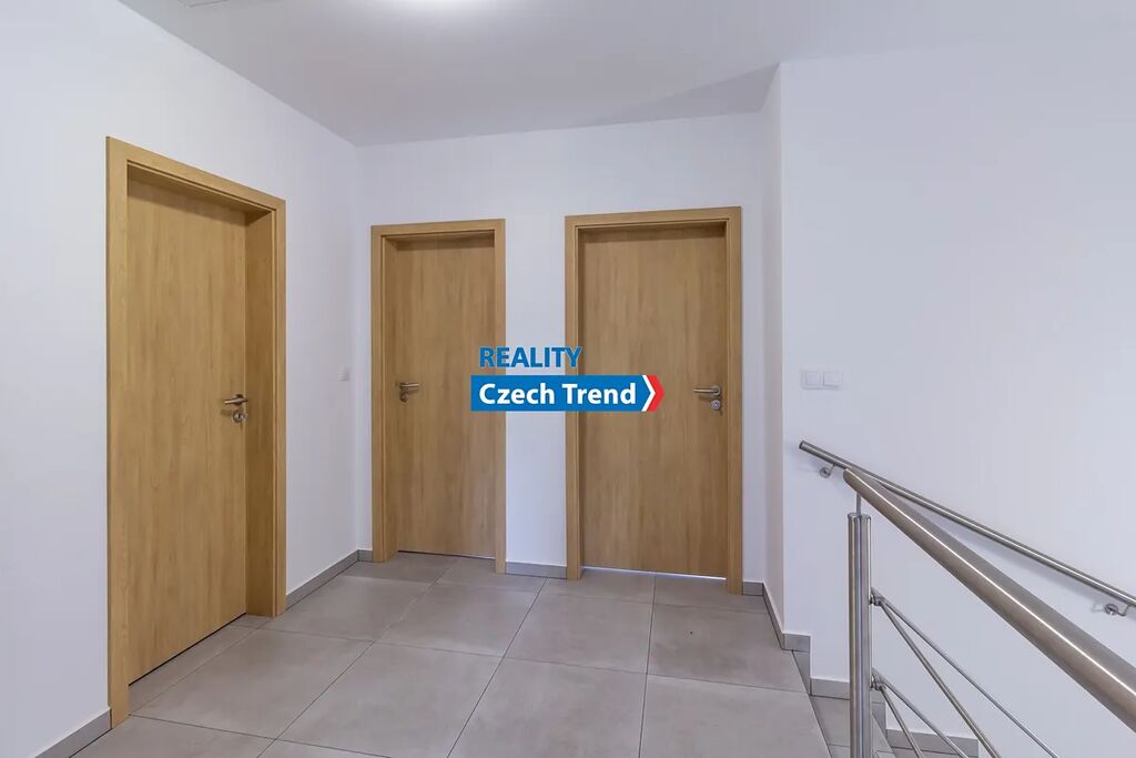 Poslední dva volné domy z osmi! Nabízíme Vám k pronájmu zcela nový moderní řadový rodinný dům 4+kk s garáží a venkovním parkovacím stáním pro jedno až dvě auta v rámci developerského projektu v obci Bystročice nedaleko Olomouce. Velmi nízké nájemné je nižší, než nájemné srovnatelně velkého bytu s garáží v Olomouci. Měsíční zálohy na elektřinu vč. topení jsou cca 4.000,- Kč, na vodu cca 1.000,- Kč. Celková velikost pozemku k domu je včetně zastavěné plochy 234 m². Dům je postaven z cihel Porotherm, okna trojskla zn. Schüco, značkové armatury Hansgrohe. V přízemí domu je vstupní chodba, koupelna se sprchovým koutem, umyvadlem, toaletou a přípojkou na pračku, technická místnost s tepelným čerpadlem o výkonu 8 kW, značky Nibe F 2040-8 + VVM 225 s bojlerem o obsahu 180 l, kuchyňský kout s kuchyňskou linkou s vestavnými nerezovými spotřebiči a přípravou na myčku, obývací pokoj s francouzským oknem a vstupem na částečně zastřešenou terasu a bezúdržbovou zahradu, schodiště do patra. V patře domu jsou tři ložnice, šatna a koupelna s vanou, umyvadlem, toaletou, bidetem a přípojkou na pračku. V celém domě včetně garáže je na podlaze dlažba s teplovodním podlahovým vytápěním. Dům je připojen na optický kabel, rozvody internetu a TV signálu jsou v každém pokoji.