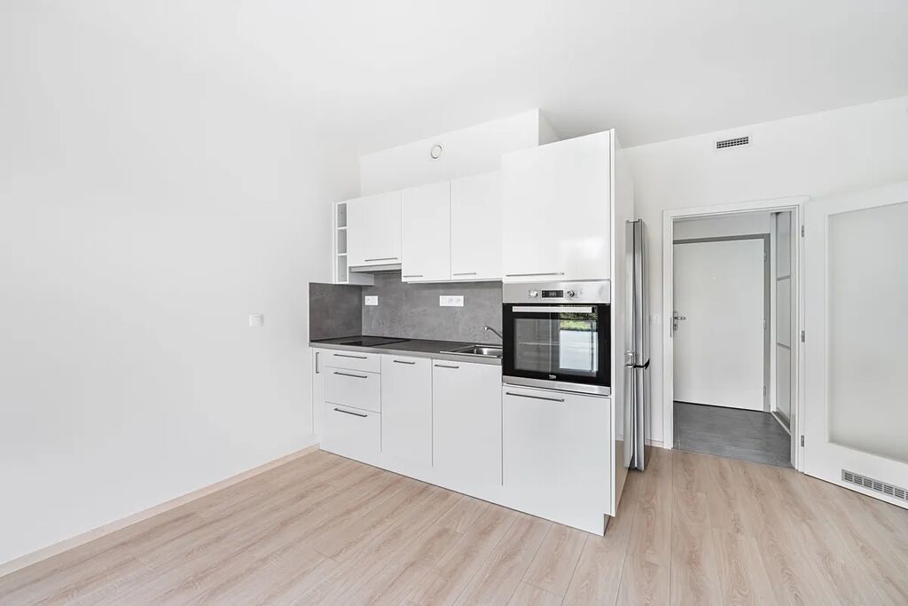 Hlavní místnost je jeden otevřený prostor, který si snadno zařídíte podle sebe. Vejde se sem postel, pohovka, stůl i malý pracovní koutek. Kuchyňská linka je už připravená a plně vybavená: sklokeramická deska, horkovzdušná trouba, myčka, digestoř, lednice s mrazákem.