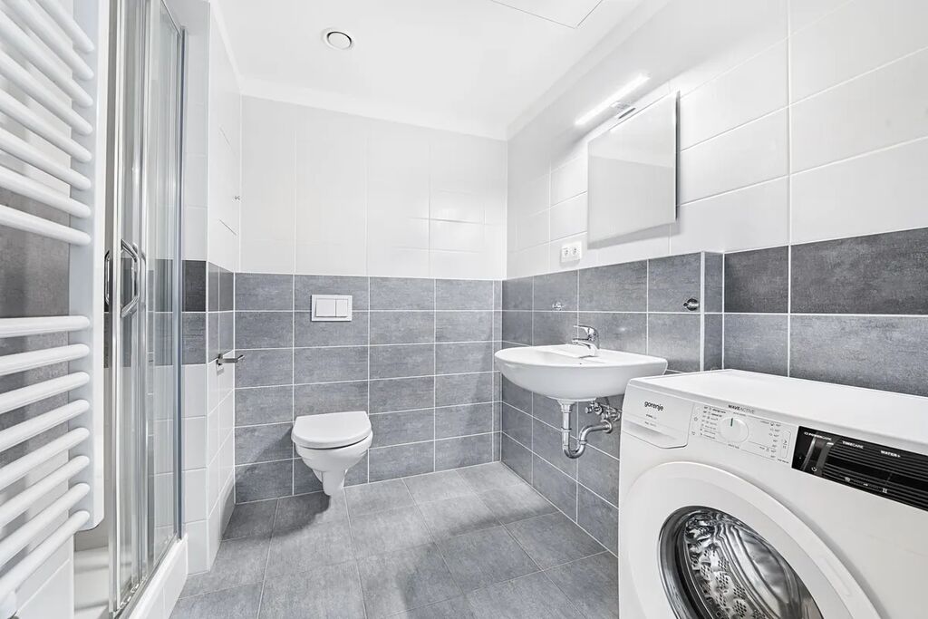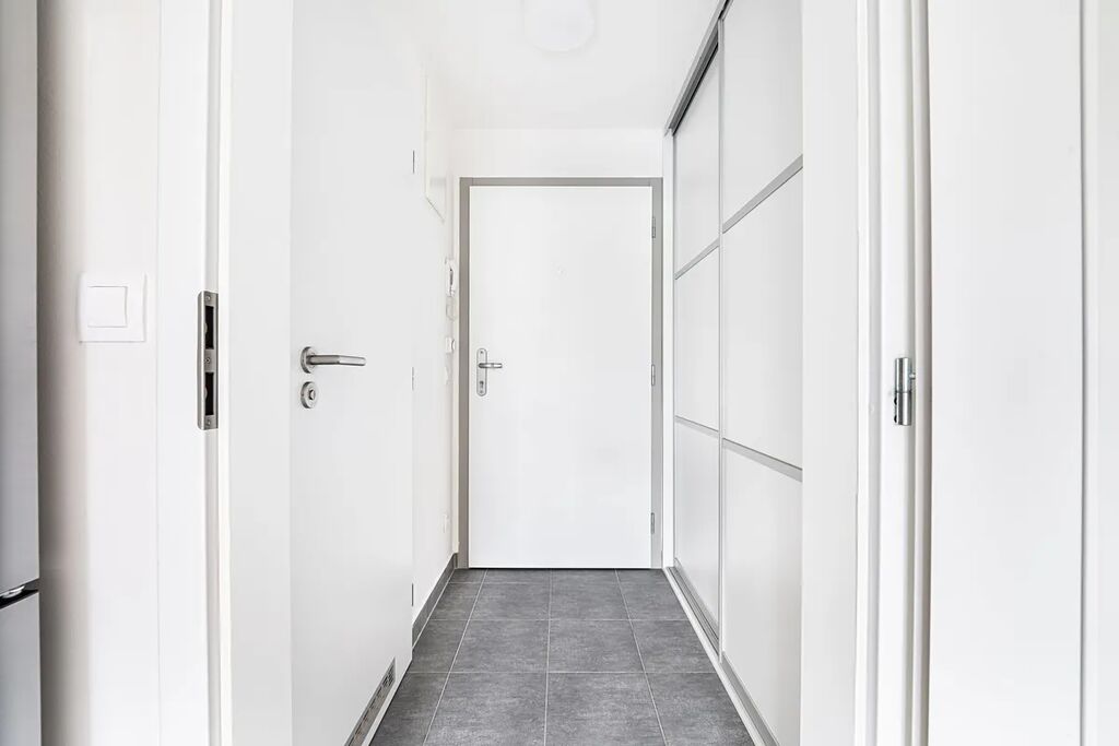 Byt má užitnou plochu 29 m² a nachází se ve 2. patře sedmipodlažního domu. Hned za vstupními dveřmi vás přivítá předsíň s vestavěnou skříní. Po pravé straně se nachází koupelna – malá, ale přesně taková, jakou potřebujete. Sprchový kout, toaleta, pračka. Všechno na svém místě, všechno po ruce.