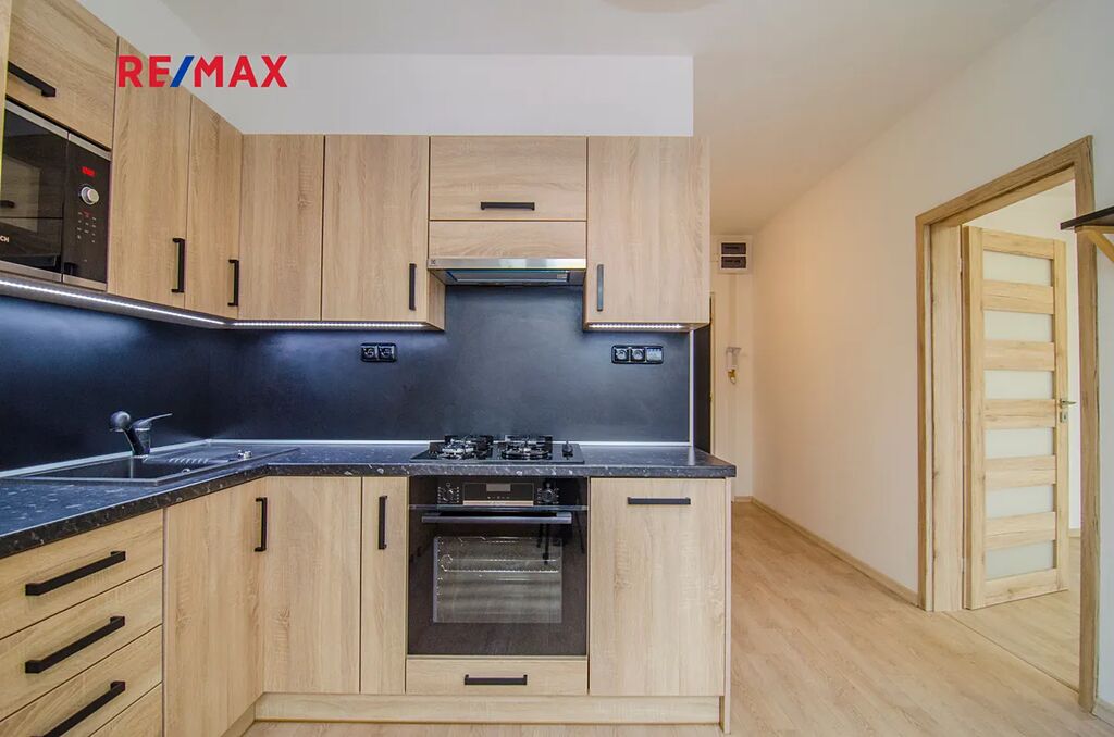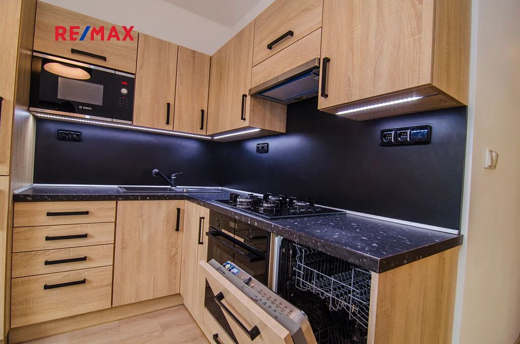Kuchyňská linka je postavena do L se zabudovanými spotřebiči - myčka, lednice s mrazákem, trouba, plynová varná deska, mikrovlnka a digestoř. Na spodní části horních skříněk je LED osvětlení.