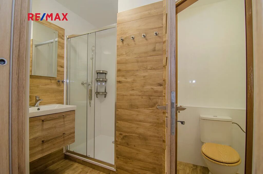 Po rekonstrukci koupelny je zde sprchový kout, umyvadlo s horní i spodní skříňkou, samostatné WC a prostor pro pračku a sušičku. Koupelna je vybavena elektrickým otopným žebříkem.