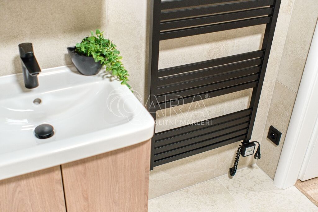 Prostorná koupelna potěší tím, že se do ní bez problémů vejde pračka i sušička – bez kompromisů.