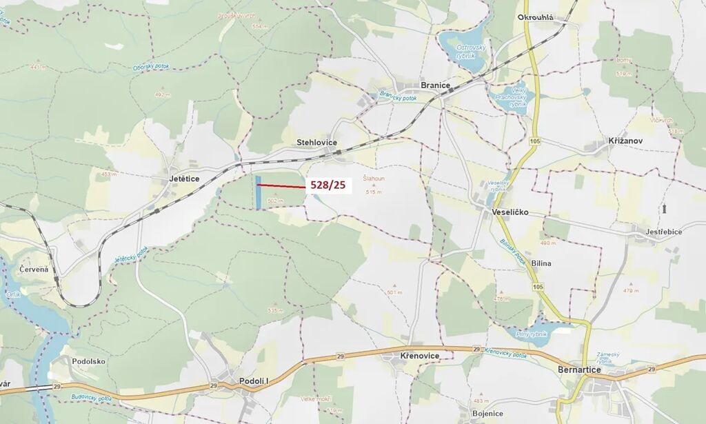 Lesní pozemek o výměře 29 451 m2, parcelní číslo 528/25, podíl 1/1, katastrální území Stehlovice, obec Stehlovice, obec s rozšířenou působností Milevsko, okres Písek, Jihočeský kraj. Částečně po těžbě.