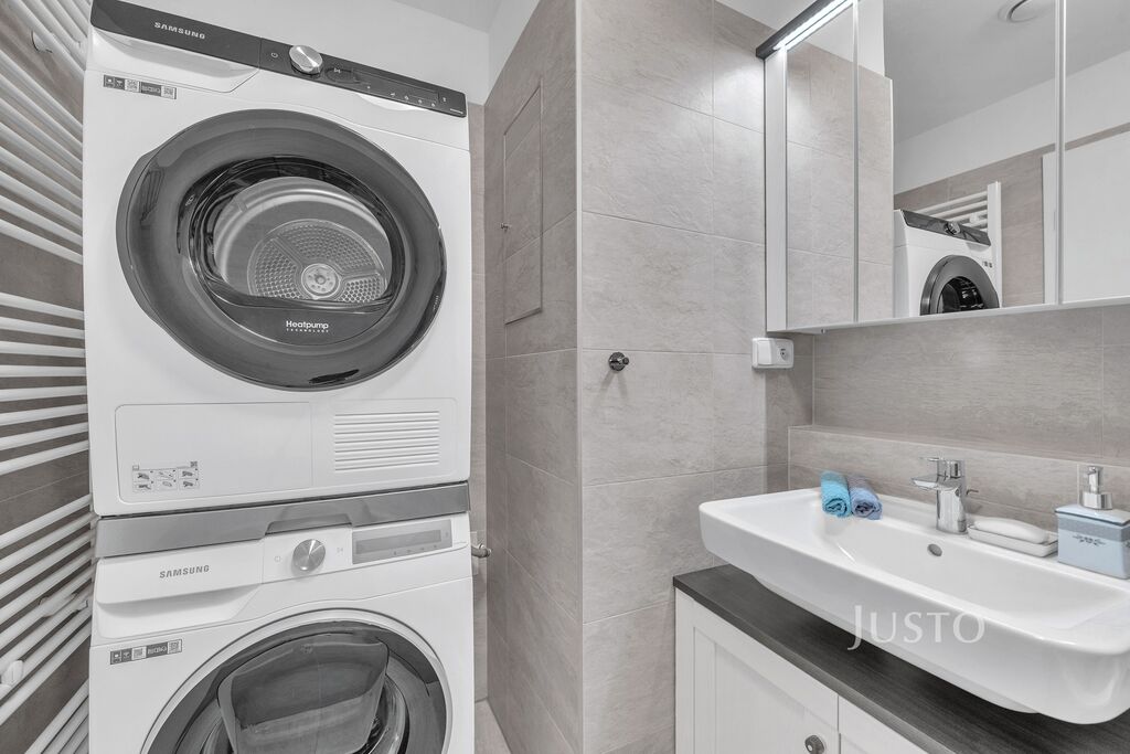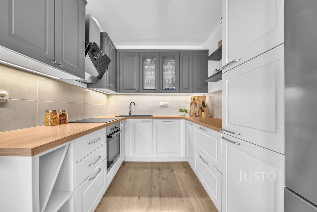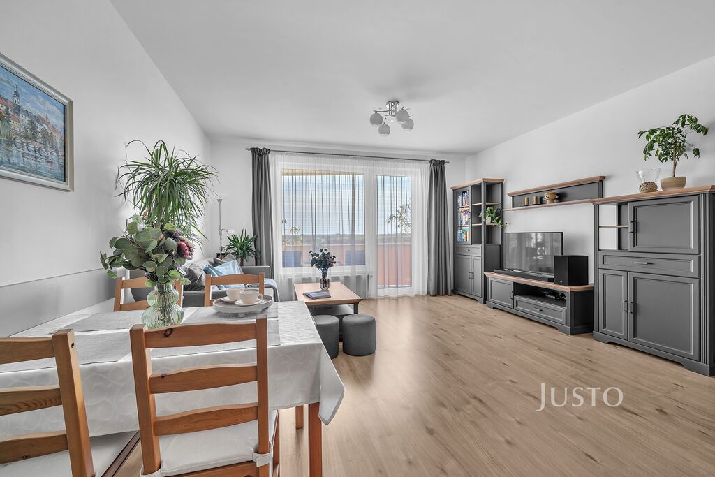 Byt je situován ve 2. podlaží třípatrového domu s výtahem. Dispozice zahrnuje světlý obývací prostor s kuchyňským koutem, který je vybaven kvalitní kuchyňskou linkou s vestavěnými spotřebiči včetně myčky, elektrické trouby a varné desky. Byt je částečně vybaven, což umožňuje novému majiteli dotvořit si interiér podle vlastních představ.