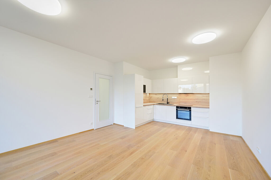 Byt je vybaven moderní kuchyňskou linkou se všemi vestavěnými spotřebiči, včetně myčky nádobí, lednice s mrazákem, elektrické trouby, sklo keramické varné desky, mikrovlnné trouby a digestoře. Součástí pronájmu není pračka ani sušička.