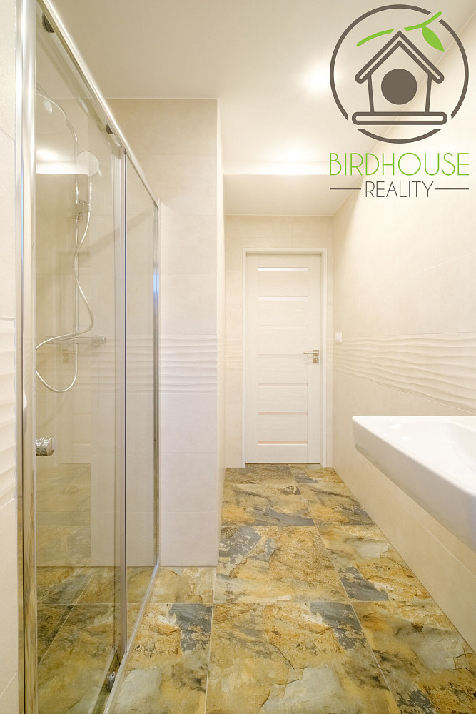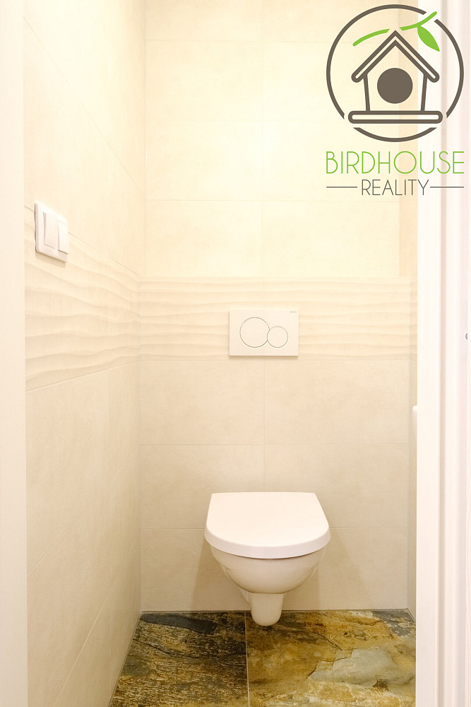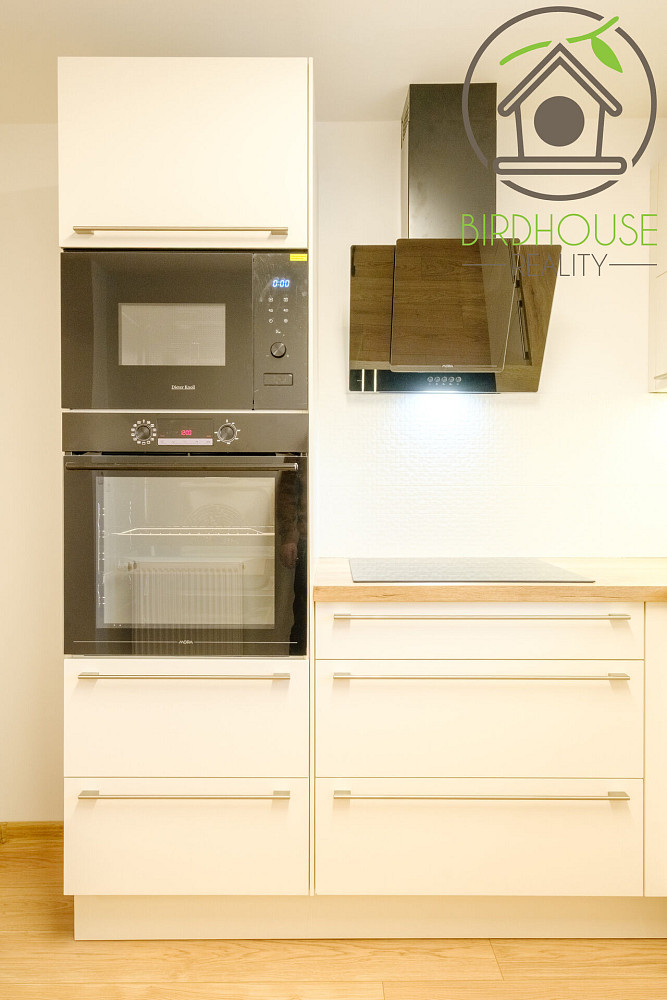 Byt je skvěle dispozičně řešen a zahrnuje tři samostatné pokoje, kuchyni a obývací pokoj s přímým vstupem na balkón. Kuchyně je kompletně vybavena moderní vestavěnou linkou, včetně indukční varné desky, horkovzdušné trouby, mikrovlnné trouby, myčky nádobí, moderní digestoře a velké lednice s mrazákem. Moderní koupelna disponuje sprchovým koutem a díky prakticky řešenému prostoru se zde nabízí místo pro pračku i sušičku. Dále je v bytě k dispozici i samostatné WC.