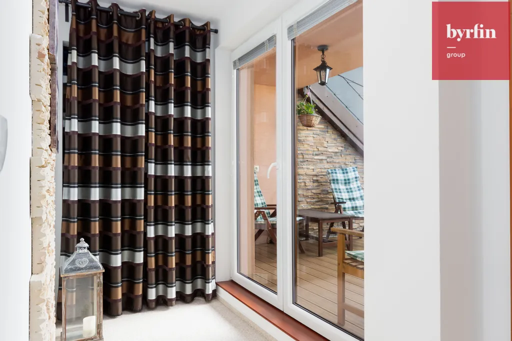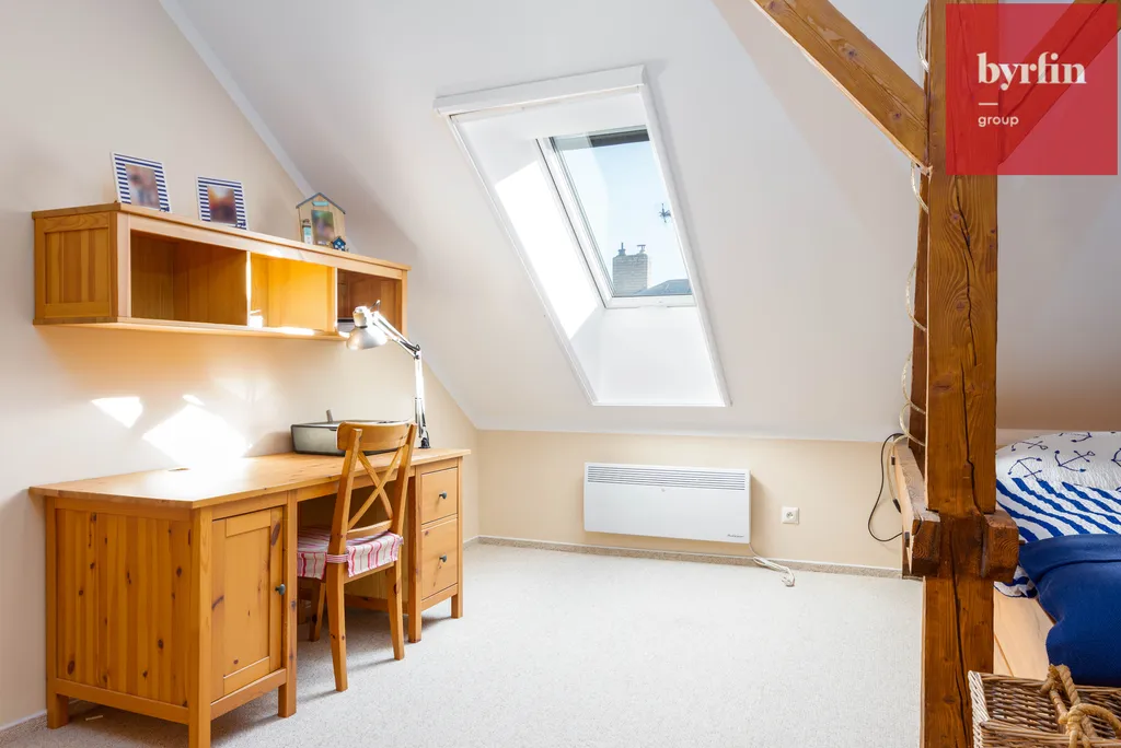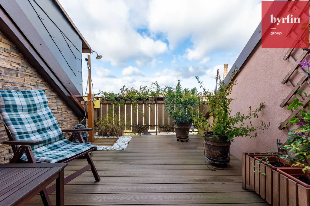 Druhá část mezonetu: Pokoj, ložnice , šatna a vstup na prostornou terasu, kde si můžete naplno užívat letních slunečných dnů.
