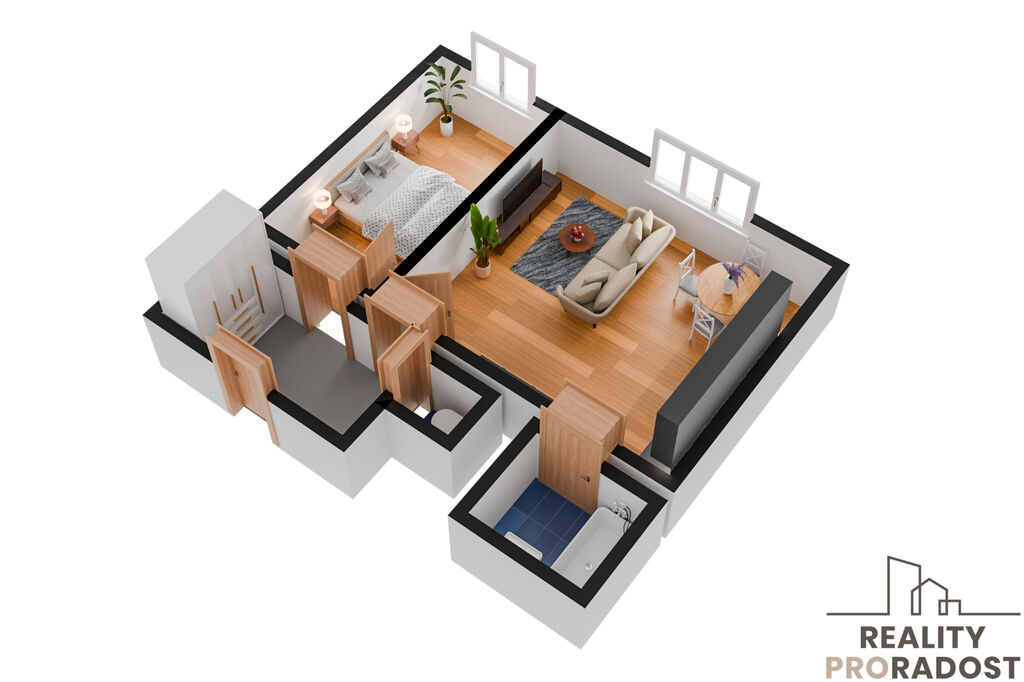 Dispozice bytu nabízí pohodlné a praktické bydlení: vstupní chodba s úložným prostorem, obývací pokoj s kuchyňským koutem, ložnice, koupelna s vanou a toaleta zvlášť.