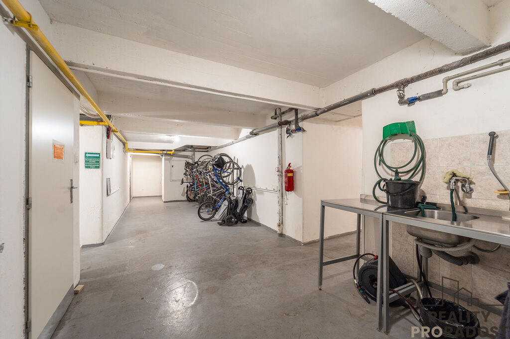 Uzamčená sklepní kóje a možnost využívat prostorné společné sklepní prostory a nádherný klidný zelený dvůr.