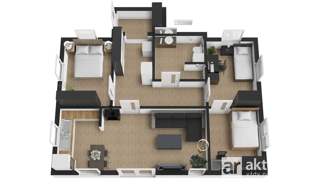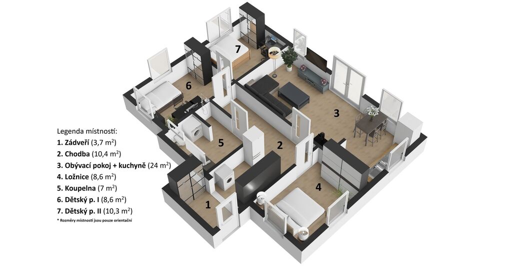 - prostorná koupelna se sprchovým koutem, závěsné WC, příprava pro pračku