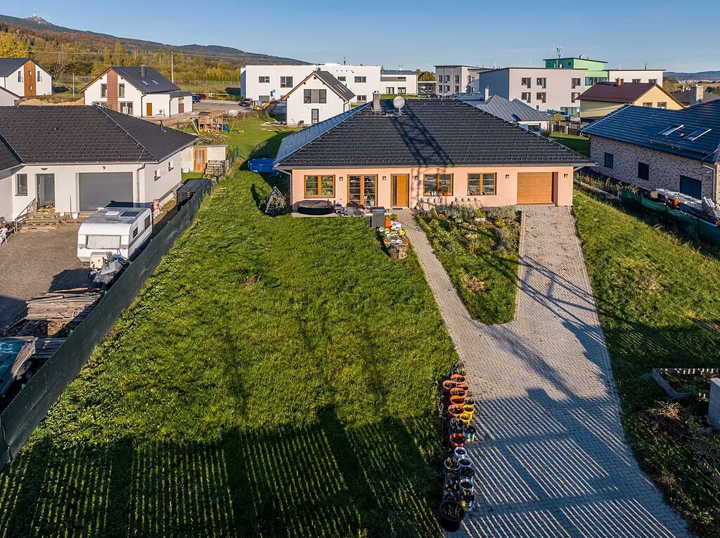 Dispozice: Obývací pokoj s kuchyňskou linkou a jídelnou, komora na potraviny - špajz, 3x ložnice, koupelna s vanou, sprchovým koutem a WC, hala, samostatné WC, garáž, technická místnost.