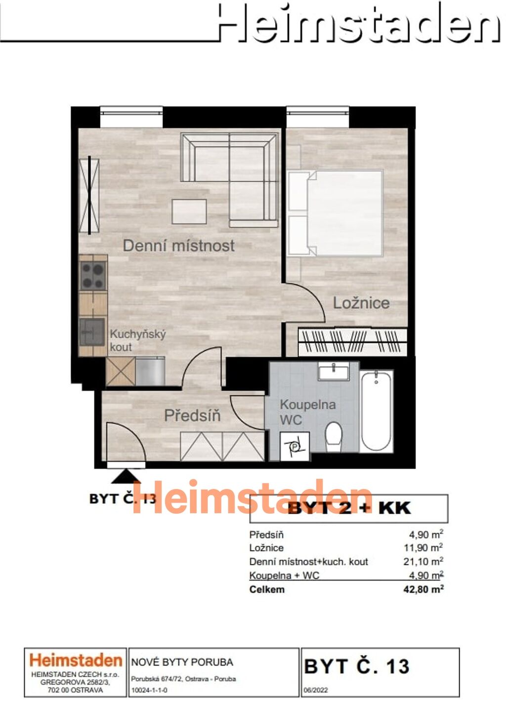 Hlavní obytný prostor tvoří moderní kuchyň s obývacím pokojem, která zaujme elegantní linkou s vestavěnými spotřebiči – včetně elektrické trouby, varné desky i myčky nádobí. Na kuchyň plynule navazuje obývací část, kde si snadno vytvoříte místo pro relax i společné chvíle. Z obývacího pokoje se vstupuje do ložnice, která poskytuje klidné zázemí a dostatek prostoru pro manželskou postel i úložné řešení.