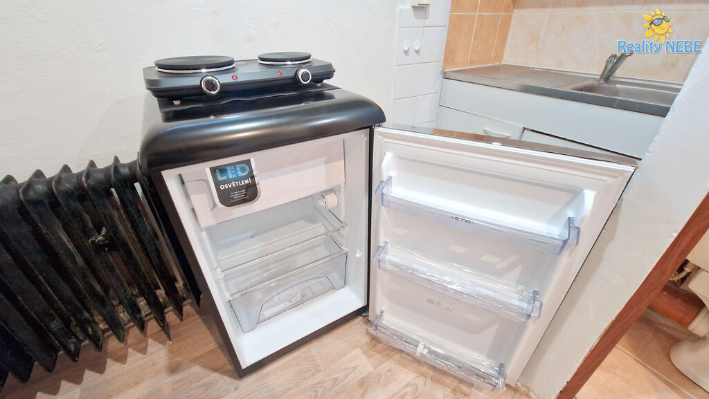 Součástí je postel, sklopný stolek a židle. Po domluvě lze dodat ledničku. V bytě není prostor na umístění pračky.