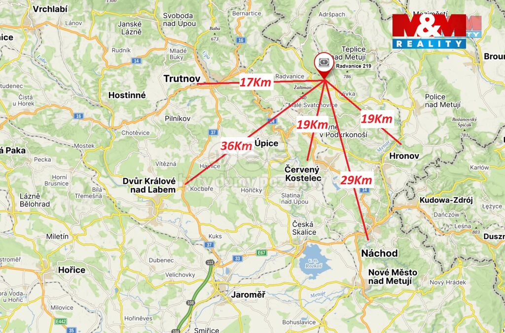 Parkování je možné přímo za domem, takže se nemusíte obávat o místo pro své auto. Radvanice nabízí výbornou občanskou vybavenost – v docházkové vzdálenosti je obchod, škola, školka, pošta i zastávka autobusu. Okolí je obklopené přírodou. Prohlídkový den se koná 26.11 od 15h. Pro sjednání prohlídky kontaktujte makléře.