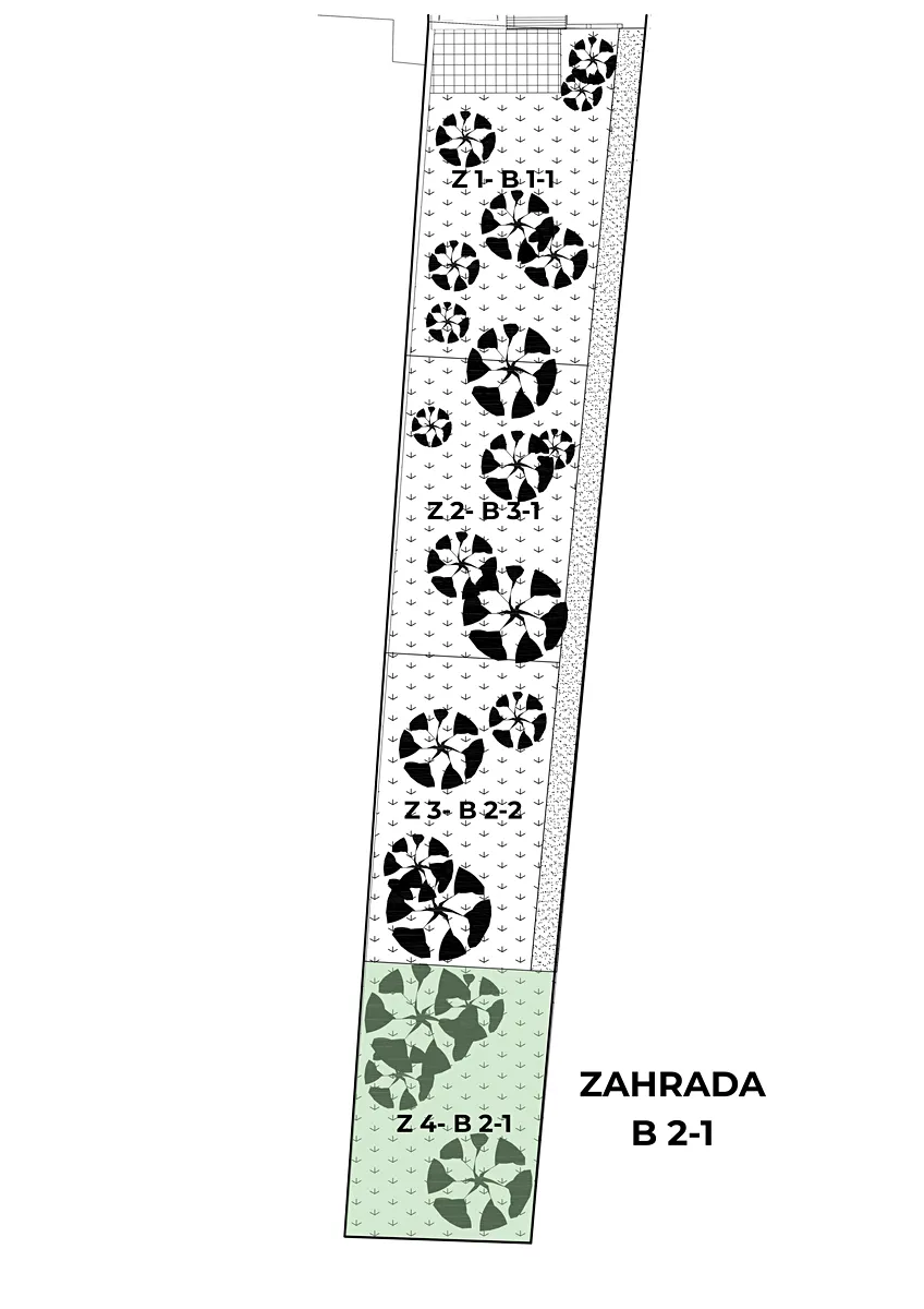 Čtyři oddělené zahrady, každá k jednomu bytu, se nachází v přízemí domu v zadní části. Ať už budete zahradu využívat ke grilování, koupání, zábavě, relaxu, budete pěstovat vlastní zeleninu a ovoce, nebo pouze vysadíte trávník a květiny, vždy budete mít svůj vlastní kousek přírody.