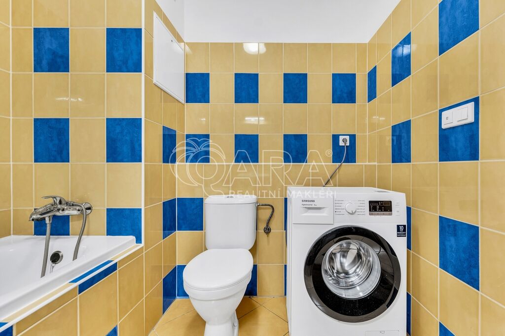Součástí vybavení je kuchyňská linka se spotřebiči (sklokeramická varná deska, elektrická trouba, lednice s mrazákem a mikrovlnná trouba). V koupelně je vana a WC. K dispozici budete mít také pračku. Podlahy v bytě jsou plovoucí, v koupelně je dlažba.