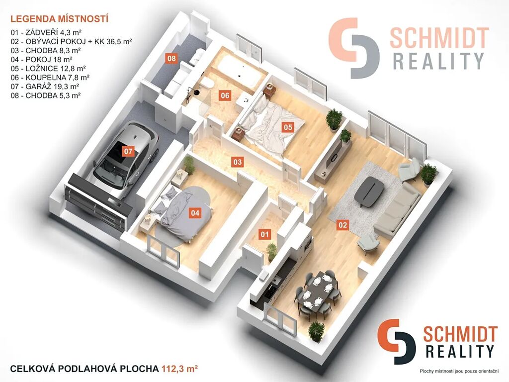 Dispozice domu je praktická a pohodlná: dvě ložnice, kuchyně, koupelna, dvě samostatné toalety, prostorná garáž a terasa s přímým vstupem na zahradu.