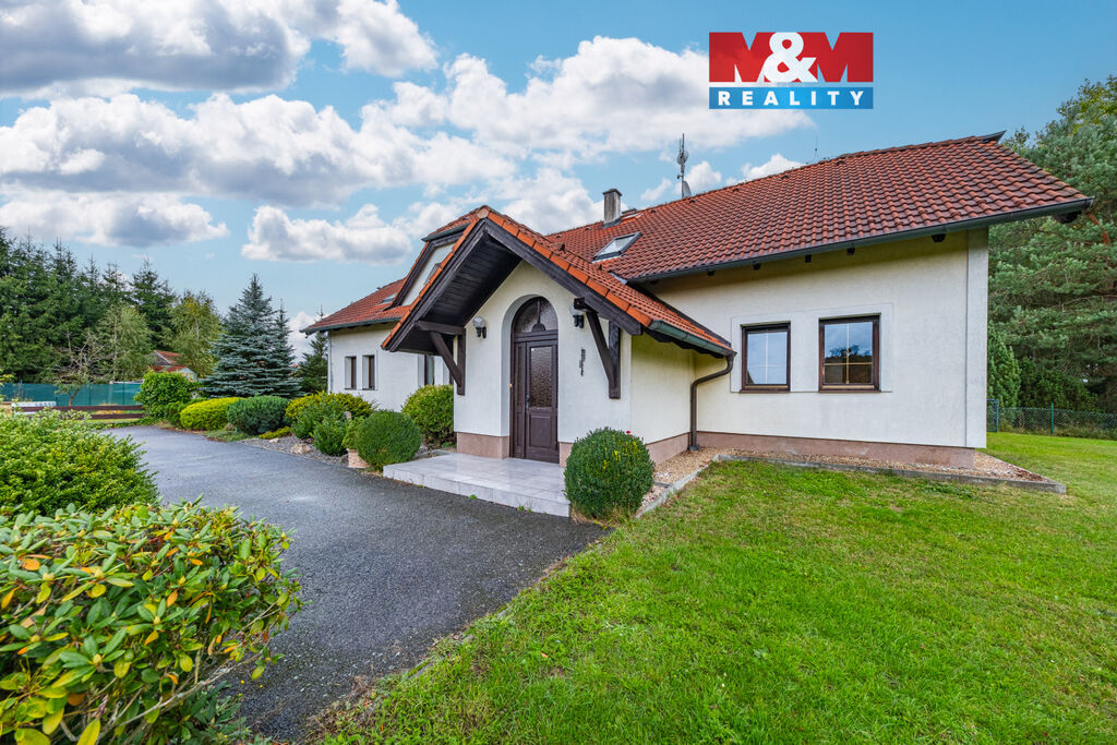 Celková plocha pozemku činí 2 263 m², z čehož značnou část tvoří pečlivě udržovaná okrasná zahrada obklopující celý dům. Dominantou venkovního prostoru je vyhřívaný bazén, zahradní domek a dvojgaráž s úložným prostorem v podkroví.
