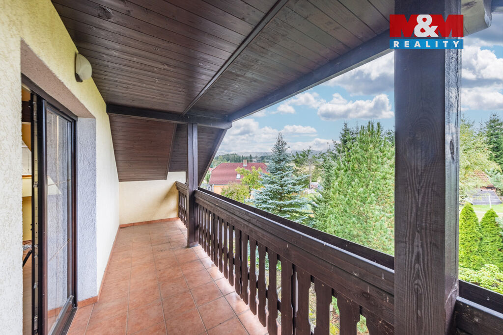 velký obývací pokoj s krbem a balkonem, odkud je krásný výhled do zeleně.