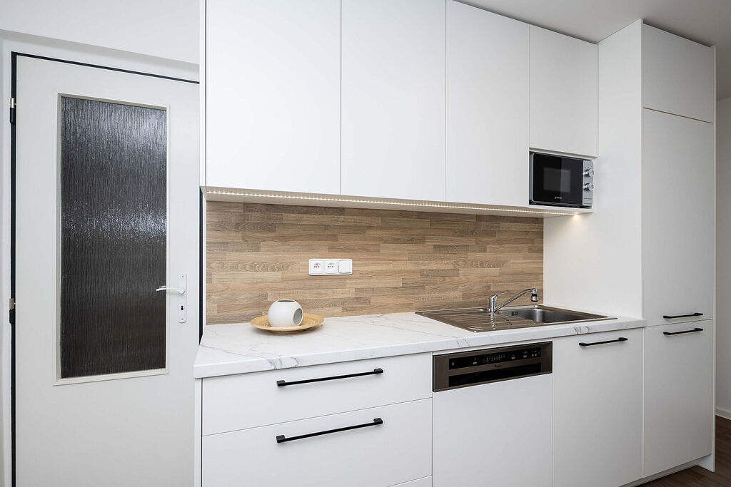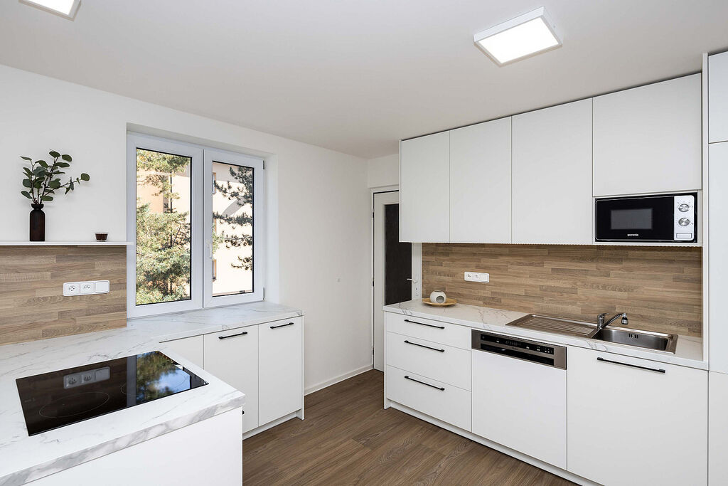 V bytě jsou k dispozici veškeré kuchyňské spotřebiče i pračka. V ložnici je prostorná vestavěná šatní skříň a v celém bytě jsou i nové podlahy.