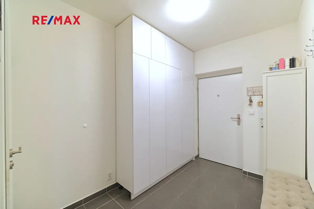 Celý byt je vybaven kvalitními vestavěnými skříněmi v bílém designu, které nenápadně doplňují moderní interiér a poskytují dostatek úložného prostoru.