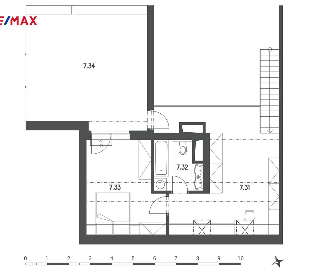 • Ve spodní části se nachází vstupní chodba, prostorný obývací pokoj s kuchyňským koutem, ložnice a samostatná toaleta s umyvadlem.