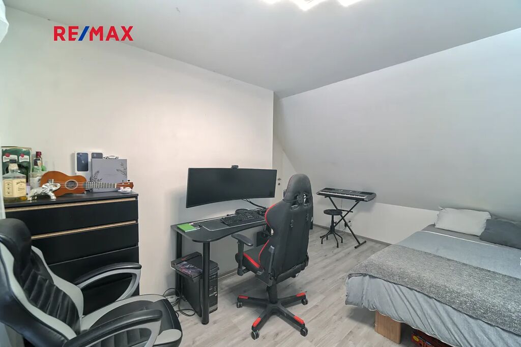 • V horním podlaží, kam vede elegantní schodiště, jsou dva světlé pokoje, koupelna s vanou a WC a již zmíněná terasa přístupná i přímo z jednoho z pokojů.