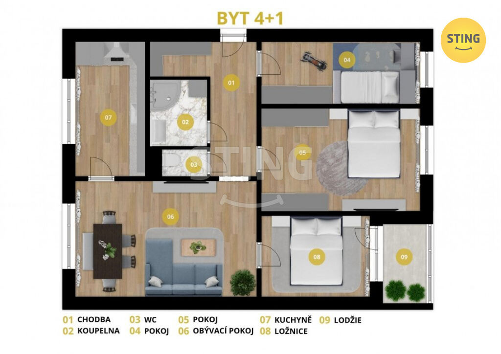 K bytu náleží i zasklená lodžie, vybízející vytvoření zimní zahrady a praktická sklepní kóje.