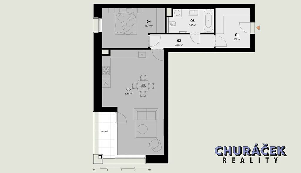 Apartmán se prodává kompletně vybavený, včetně moderní kuchyňské linky a veškerého nábytku, což umožňuje okamžité využití bez dalších investic. Dispozice zahrnuje prostorný obývací pokoj s kuchyňským koutem a přímým vstupem na lodžii, ložnici, koupelnu s vanou a toaletou. Díky promyšlenému uspořádání nabízí apartmán maximální komfort a pohodlí.