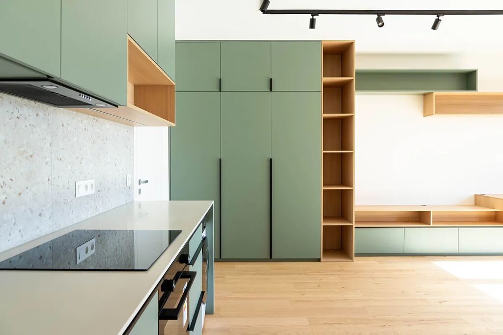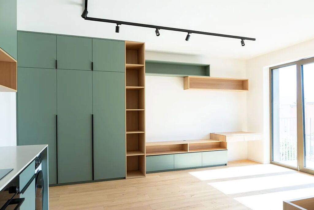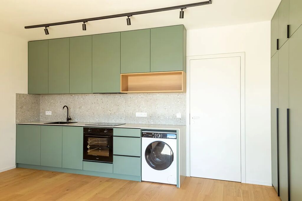 Vybavení bytu: předsíň s praktickými úložnými prostory, kuchyňská linka na míru se spotřebiči (lednice s mrazákem, trouba, varná deska, digestoř, myčka), pračka, postel bez matrace a obývací stěna na míru.