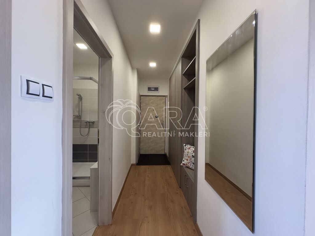 V koupelně je sprchový kout a pračka, toaleta je samostatná. Na chodbě se nachází velkorysé vestavěné úložné prostory, které oceníte v každodenním provozu.