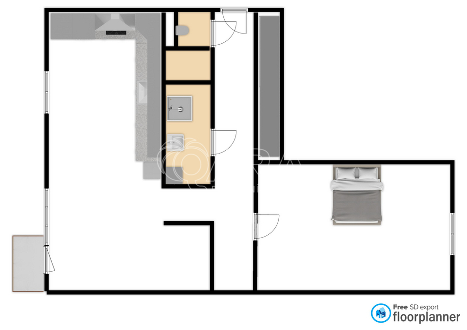 Hlavním prostorem bytu je světlý obývací pokoj s moderní kuchyňskou linkou, orientovaný do tichého vnitrobloku. Ložnice směřuje do ulice, ale díky výšce podlaží je zde klidné prostředí.