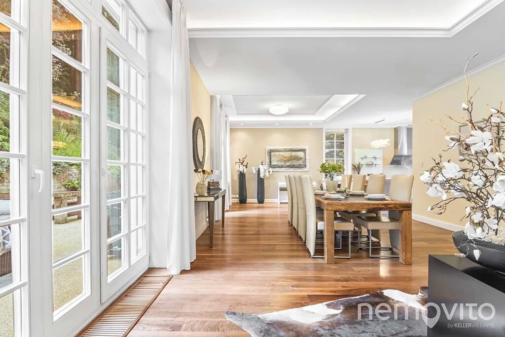 The dominant feature of the house is the living room, whose area is almost 100 sqm in total, with several French windows. These provide amazing views of the green garden, which is designed with maximum privacy. The living room has a fireplace and an entrance to the terrace. Thanks to the terrain difference, it is completely separated from the neighboring street. The space can easily accommodate up to twenty guests.