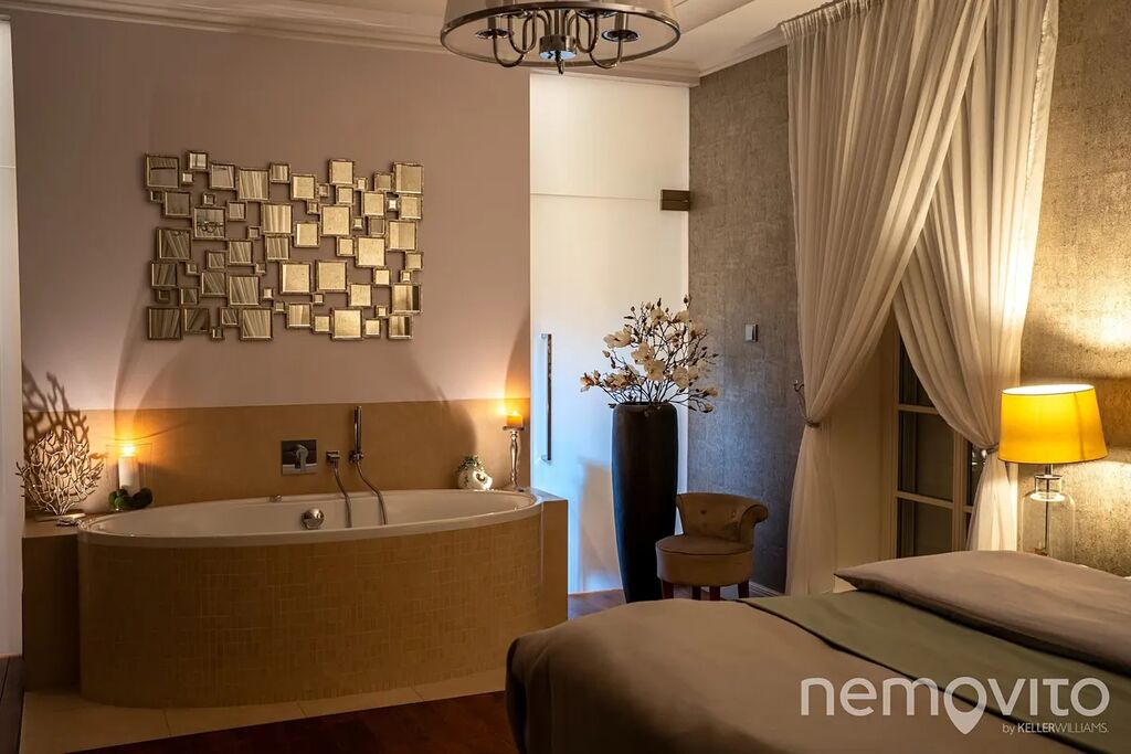 On the first floor there is also a quest room or an office (dressing room, bathroom). The hall is dominated by a beautiful wooden staircase. The master bedroom (24 sqm) with an en-suite bathroom and a free-standing bathtub also has a dressing room. The children's rooms (19 and 25 sqm) are connected by a bathroom and a large dressing room. Above the entire floor plan of the house there is a spacious attic. The current layout offers a 4-bedroom villa with 3 bathrooms.