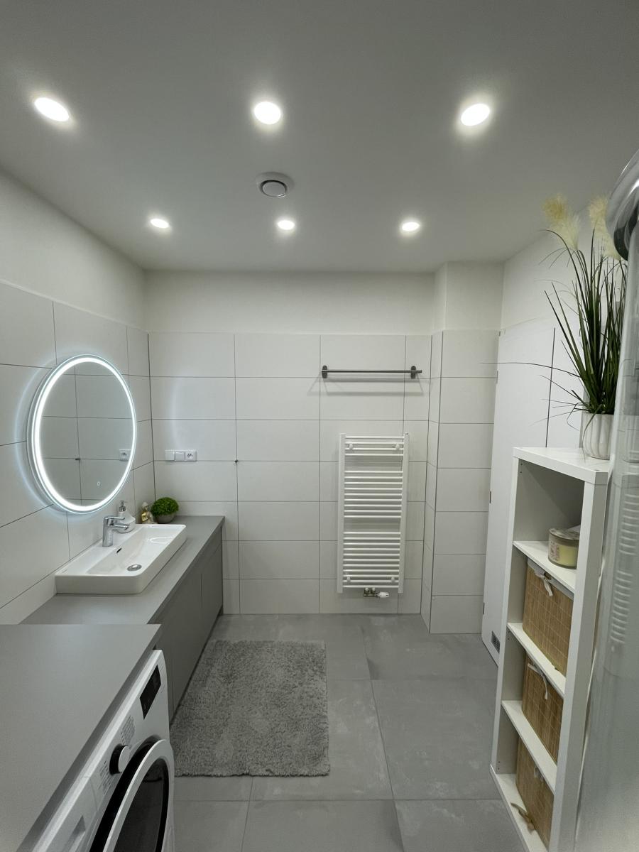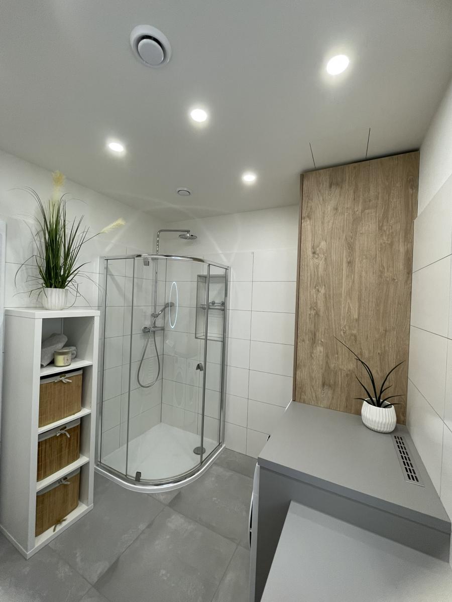 Osvětlení ve všech místnostech zajišťuje stropní bodové osvětlení Philips, v ložnici a pokoji jsou chytré vypínače Aqara - ideální pro propojení s chytrou domácností. Vstupní dveře jsou vybaveny videotelefonem pro pohodlné a bezpečné otevírání dveří na dálku. Vytápění zajišťuje vlastní plynový kondenzační kotel Baxi Duo-Tec s průtokovým ohřevem vody. V celém bytě je vodní podlahové vytápění, doplněné o radiátory v každé místnosti. V obývacím pokoji jsou připravené vývody pro instalaci klimatizace.