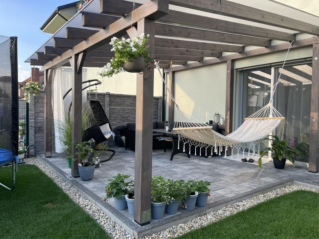 - Terasa s pergolou (5,6 × 4,5 m) s integrovaným LED osvětlením, 1 rok stará