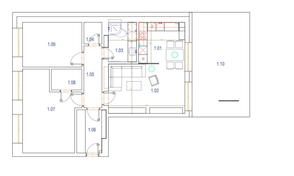 Dispozice bytu: Obývací pokoj s kuchyňským koutem 30 m2, ložnice 20 m2, pokoj 13 m2, koupelna 7,5 m2, WC 2 m2, šatna 3 m2, chodba 5,5 m2, zádveří 6 m2.