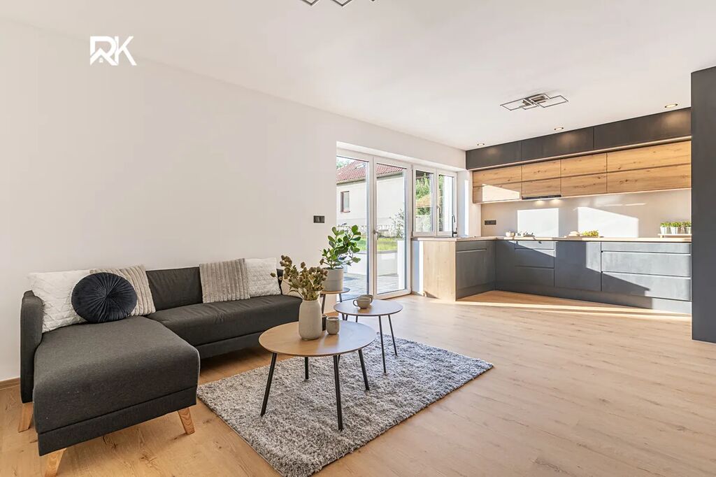 Dvě koupelny s WC, prostorný obývací pokoj s výstupem na terasu, tři ložnice a moderní kuchyňská linka AEG. Vše nové, včetně rozvodů elektřiny, vody i kanalizace.