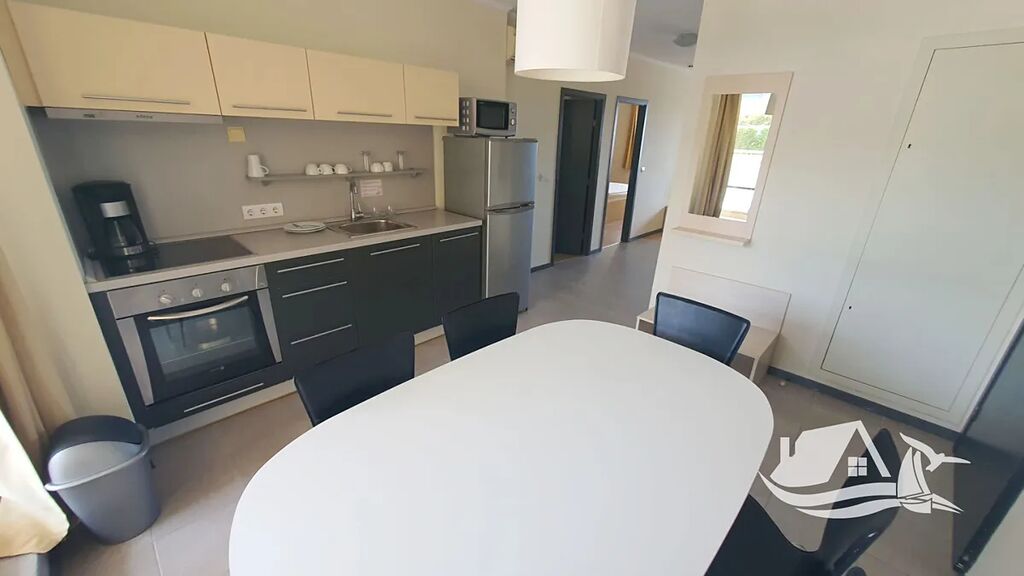 Byt je umístěn ve druhém patře budovy, přičemž díky terénnímu rozdílu odpovídá vstupní úroveň druhému patru. Po vstupu vás přivítá světlý a vzdušný interiér. Kuchyň s jídelnou a prostorný obývací pokoj mají přístup na velkou terasu, která nabízí dechberoucí výhled na moře i na upravený vnitřní areál komplexu. Dvě útulné ložnice jsou perfektním místem pro odpočinek, druhá terasa zve k relaxaci, zatímco moderní koupelna s toaletou splňuje všechny požadavky na komfort.