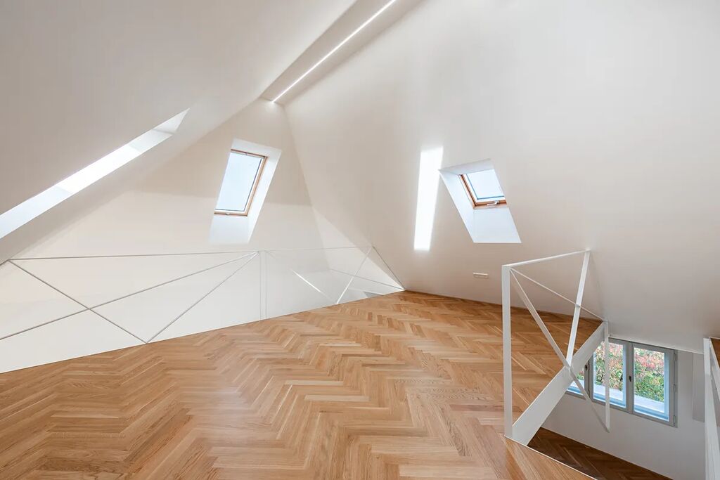 Dominantou tohoto podkrovního bytu je vzdušný společenský prostor otevřený do výšky s vloženým mezipatrem a působivým přirozeným světlem, které do interiéru vstupuje skrze architektonicky komponovanou sestavu střešních oken.