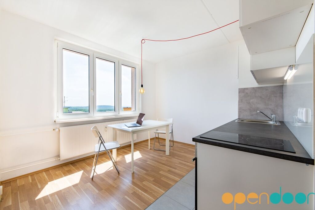 Byt s nádherným výhledem se skládá ze dvou místností - místnost s kuchyňským koutem a jídelním prostorem a dále pokojem (ložnicí). Byt prošel nákladnou rekonstrukcí - nová elektřina, nové rozvody vody a odpadu; nově vybudovaná koupelna se sprchovým koutem, umyvadlem, zrcadlem a toaletou; kuchyňská linka se spotřebiči - sklokeramická varná deska, horkovzdušná trouba, digestoř; jídelní stůl se židlemi, designová světla; nové podlahy. Dům má nový výtah, je zateplený a je čistý a tichý; skvělé místo pro bydlení.
