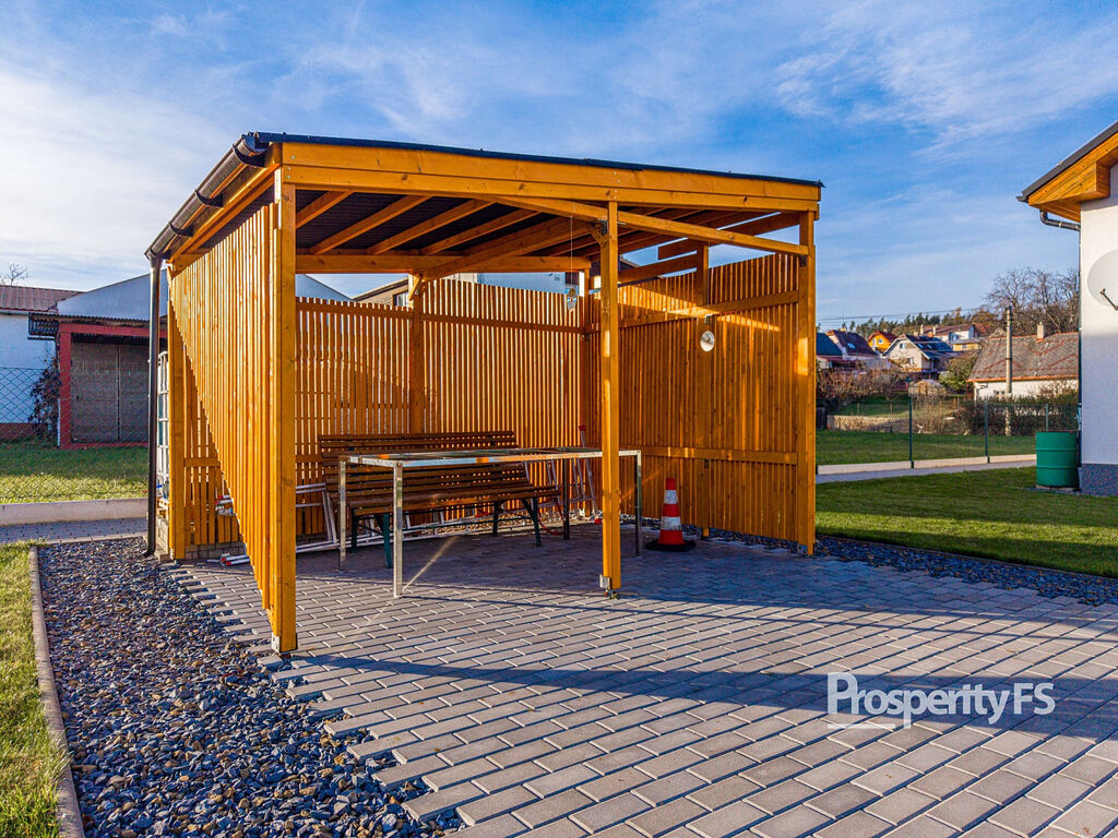 Na udržované zahradě vás potěší pergola, dva zahradní domky a dostatek prostoru pro odpočinek i zahradničení. Celý pozemek je oplocený a nabízí parkování až pro čtyři auta přímo před domem.