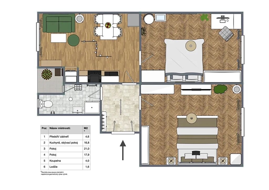 • Dvě samostatné ložnice orientované na jih – velmi světlé, tiché a příjemně prostorné