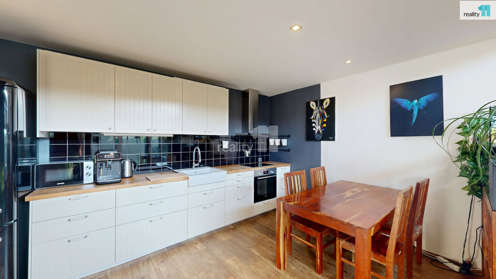 Má skvělou dispozici - z podlouhlé velké zimní zahrady, která je využívána jako pracovna a druhý obývací pokoj, se vchází do zádveří s velkou vestavnou skříní na boty a kabáty. Odtud pak do obývacího pokoje s kuchyňským koutem (velká kuchyňská linka, prostor pro jídelní stůl i rohovou pohovku), který je útulným centrem pro setkání s rodinou a přáteli. Z obývacího pokoje se pak vchází do menší chodby, s výklenkem na technické zázemí (kotel, pračka, sušička a mnoho polic), vstupem do koupelny se sprchovým koutem a toaletou a do ložnice (studentského pokoje) s dalšími skříněmi.