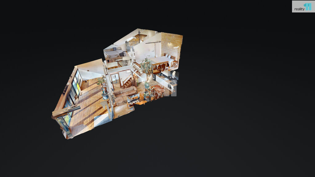 Dvě ložnice a hlavní koupelna s vanou, nás čekají v patře, kam se dostaneme po dřevěných schodech. Pokud by nový majitel pořebova potřeboval, dá se přistavět ještě pokoj nad střechu garáže, při jejíž výstavbě se s touto variantou počítalo. Dům je plný světla, i díky jedné stěně, která je kompletně prosklená. Jsou zde kvalitní podlahy, obklady i sanitární technika, podlahové elektrické vytápění, klimatizační jednotky. Majitelé nad zařízením důsledně přemýšleli, aby v domě byl dostatek úložných prostor a dál působil vzdušně a pohodlně, takže jsou využity i prostory pod schodištěm a další zákoutí. Zimní zahrada se vstupem na terasu, má přípravu i pro případné umístění krbových kamen. Terasa slouží zejména pro relaxaci, grilování, posezení a rozděluje zahradu na přední a zadní část. Přední část je travnatá s automatickou závlahou, s několika okrasnými keři a slouží zejména pro děti. Zadní část je vydlážděná, vhodná pro parkování aut. Je zde také menší technický domek, i když v garáži je opravdu dostatek prostoru i pro vášnivého kutila.