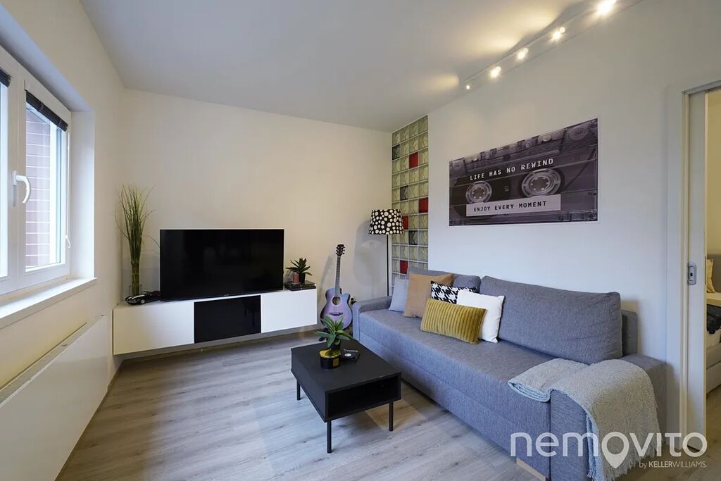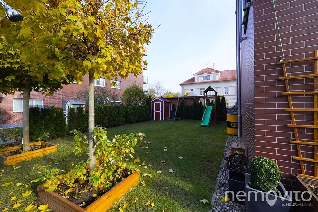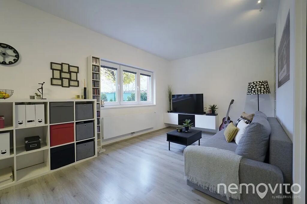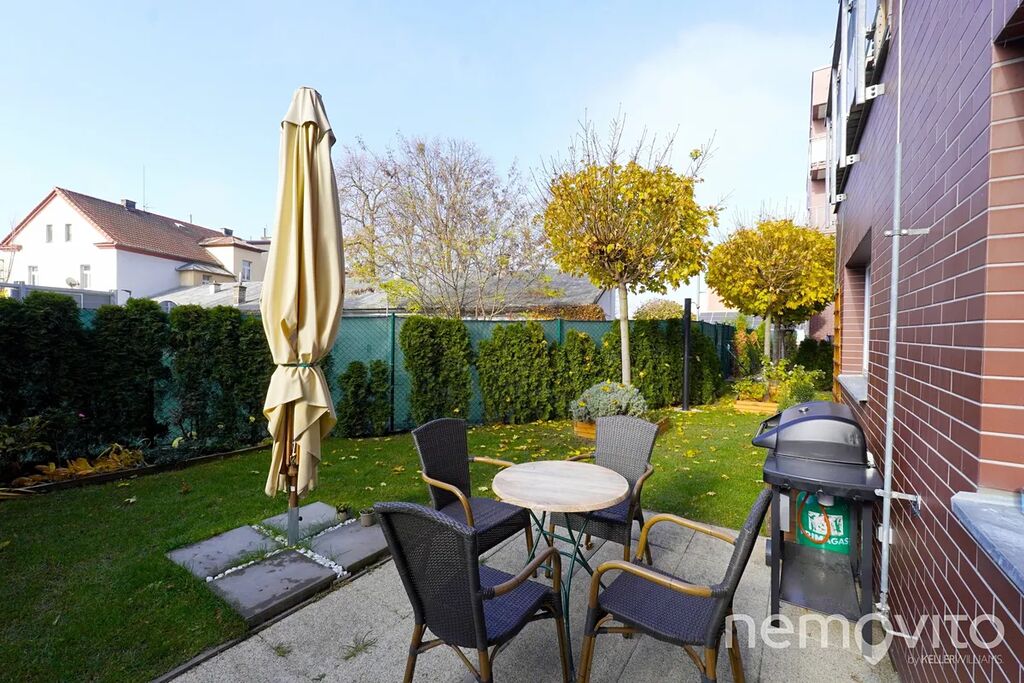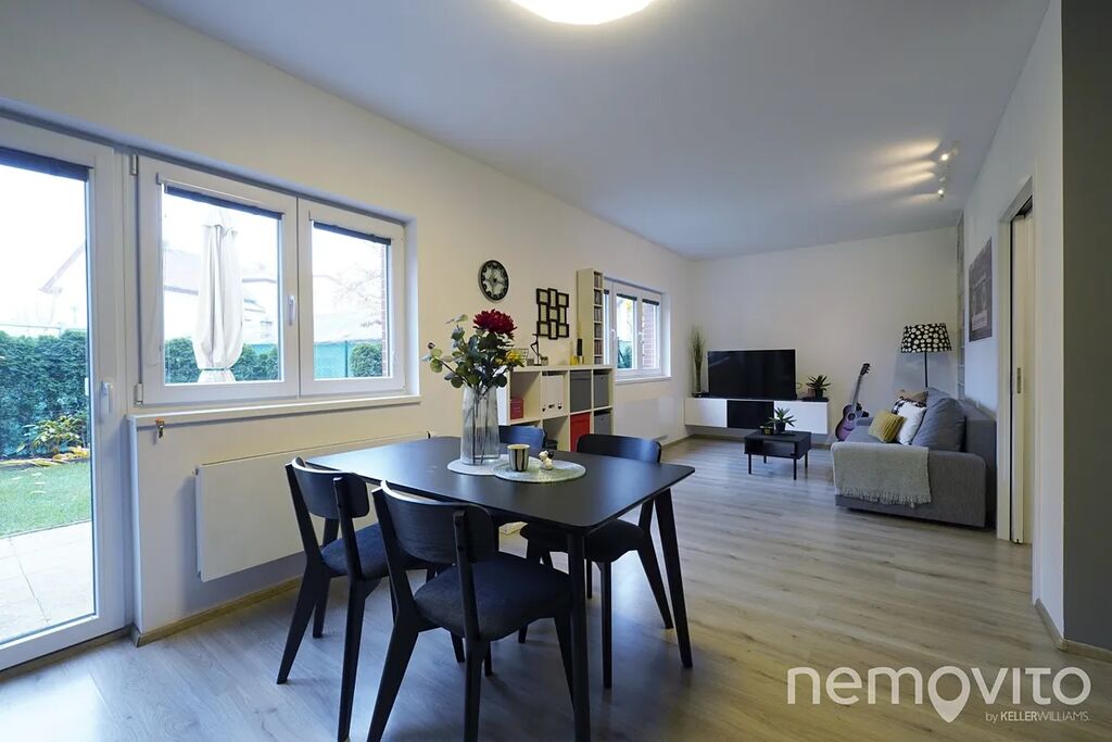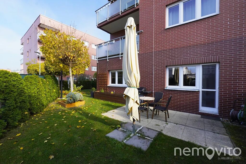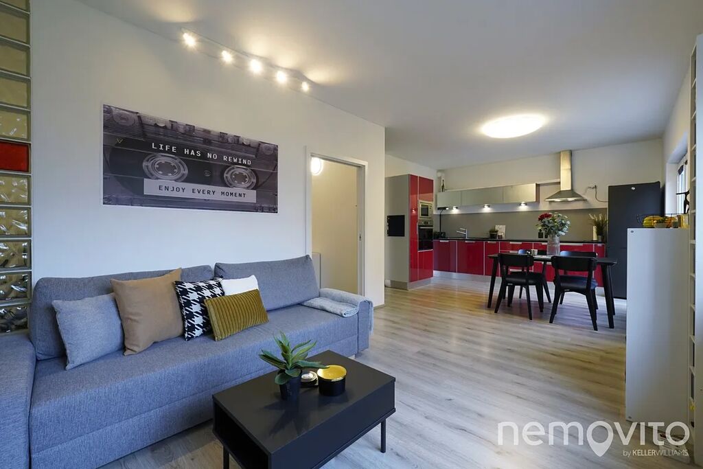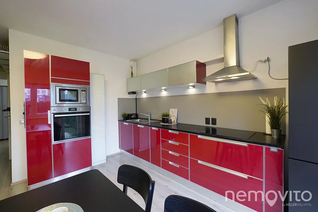 Nabízený byt je atypické 3+kk o celkové ploše 72,8 m², situovaný v přízemí domu. Jeho jedinečnost podtrhuje zahrada o výměře téměř 140 m², která náleží k bytu s právem výlučného užívání – ideální pro rodinné posezení, grilování nebo odpočinek v soukromí. Dispozice bytu nabízí prostorný obývací pokoj s kuchyňským koutem, dvě ložnice a moderní koupelnu. Dominantou obytné části je designová červená kuchyňská linka v lesku, která dodává prostoru charakter a osobitý styl.